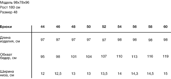 Брюки на манжете, манжеты из кашкорсе с эластаном. В поясе эластичная тесьма, кулиска отстрочена равномерно двумя паралельными строчками. В кулиску вставлен шнур с застроченными концами, продет через петли. По боковым швам вставки с диагональным подрезом в области колена, нижняя часть контрастного цвета. Карманы в боковом шве с отделочной строчкой по входу в карман.